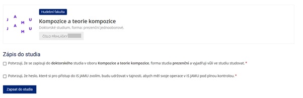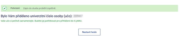 Underneath the confirmation that reads “Enrolment has been successful” you will find one very important number – the person’s UČO (university number). Remember and note this number, it will accompany you throughout your studies at the Janáček Academy of Performing Arts. You will use it to log in to the JAMU Information System – the “Set password” button, which you will find just below the enrolment confirmation, will lead you there.