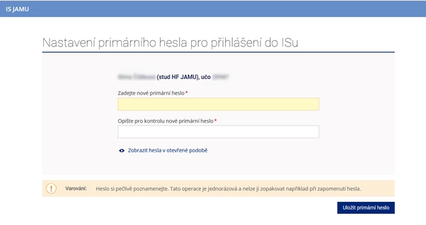 Clicking on the “Set Password” button will take you to a page where you can set your temporary password. If you have already studied at JAMU and have been assigned a UČO, you will log in with your current primary password.