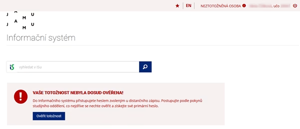 After setting your own password, you can log in to IS JAMU. For the time being, you will be in the “person not identified” status, which will be prominently displayed on each of your JAMU IS pages. Identification of persons in IS JAMU can be done either: