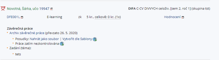 Hodnocení předmětu závěrečné práce – např. „Magisterská diplomová práce“, „Absolventský projekt“ atd. zadávejte prostřednictvím aplikace „Školitel“