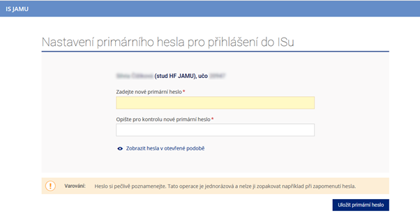 Kliknutím na tlačítko „Nastavit heslo“ se dostanete na stránku, na níž si můžete nastavit své prozatímní heslo. Pokud jste již na JAMU studovali a máte UČO přidělené, přihlašujete se svým stávajícím primárním heslem.